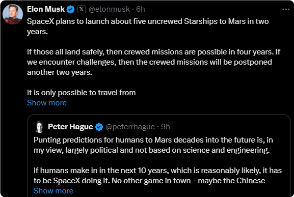 马斯克公布最新火星计划:未来2年发射5艘无人星舰